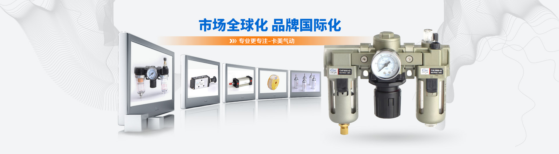 卡美氣動有限公司是一家具有現(xiàn)代化生產(chǎn)規(guī)模的專業(yè)開發(fā)、制造氣動元件的公司。主導(dǎo)產(chǎn)品有:氣源處理系列、標(biāo)準缸、迷你缸、超薄缸、QGB(大直徑)氣缸、雙軸缸、電磁閥、氣動閥、油壓缸、快速接頭、PU氣管等產(chǎn)品。